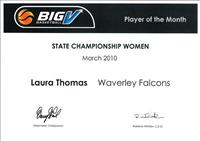 Waverley gun Laura Thomas has picked up Player of the Month honours for March after a few sterling performances early on including a near triple double in which she posted a whopping 16 points, 13 boards and 9 assists.