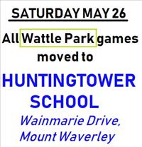 All games scheduled for Wattle Park Primary School on Saturday, May 26 have been moved to Huntingtower School, Wainmarie Drive, Mount Waverley.