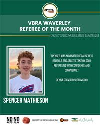 This month we would like to congratulate Spencer Mathieson! Spencer was nominated by Referee Supervisor Sienna Spencer for his confidence and composure while refereeing solo.