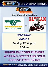 The Waverley Falcons will take on the Eltham Wildcats in Game One of their best of three Semi Finals series at Waverley Basketball Stadium this Sunday. Games two and three will be at Eltham next week, so come out and support the Falcons Men as they chase a spot in the 2012 State Championship Grand Final.